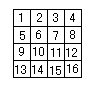 4×4の正方形の盤で遊んでみましょう。 右図の1〜16の一箇所を空欄にして遊んでみましょう。 最後に1個だけ玉を残すことが出来たところはどこでしょ うか。 |