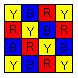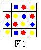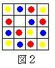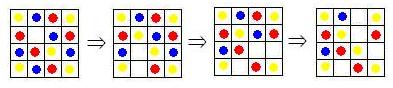 4×4のソリティアの盤を右図のように色分けします。 Y=黄色 B=青色 R=赤色 盤上に玉を全部置けば、黄色(Y)=6箇所、青色(B) =5箇所、赤色(R)=5箇所となります。これを(Y6,B5, R5)と書きます。 最初にどこを空所にするかによって、玉を1個に出来 る場合が決まります。 @ 図1のように隅を1箇所空けると、これ以上動きが取 れません。 従って、隅を空けた場合は玉を1個に出来ません。 A 図2のように、黄色(Y)の場所を空けた場合を考 えます。 この場合は(Y5,B5,R5)となります。 |
