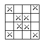 @、AよりY=黄色を1箇所空けると、 玉を1個にすることは出来ないことがわ かります。また、左右対称の色分けも 可能ですから、右図の×を空所にして ゲームを始めると玉を1個にすることは 出来ないことがわかります。 |