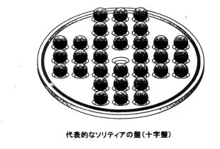 最高の1人遊びと推奨されてい る「ペグ・ソリティア」は右図の ような盤にある玉を移動させ て遊ぶゲームです。 |