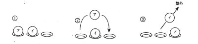 ソリティアの遊び方 【ルール】 図@のように、ある直線上に 2個の玉が並んでいて、その 隣があいているとき、アの 玉はイを飛び越して、あいた 穴に移動します(図2)。飛び 越された玉イは盤上から取 り除かれます。玉は斜めに 飛び越すことはできません。 |